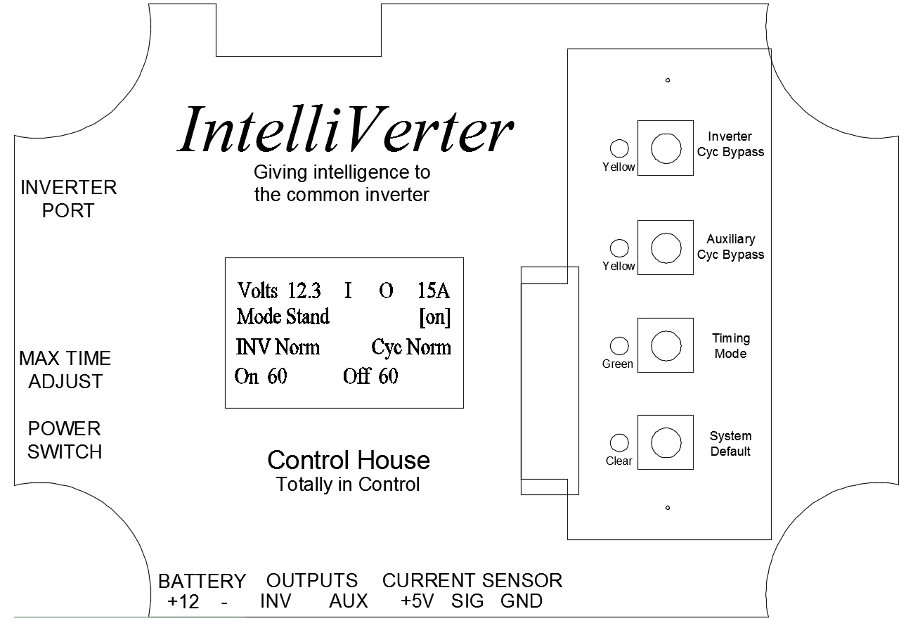 Upon connection or power-up the IntelliVerter will go through an initialization process where all outputs will be turned off and timing cycles will be disabled. The IntelliVerter will place the timing mode in standard and all cycle bypasses will be placed in normal. When shipped the maximum time adjustment potentiometer is set to 60 minutes. Thus, the control will start with on and off cycle times at 60 minutes. The power switch is located on the left side of the IntelliVerter below the identified point on the faceplate.