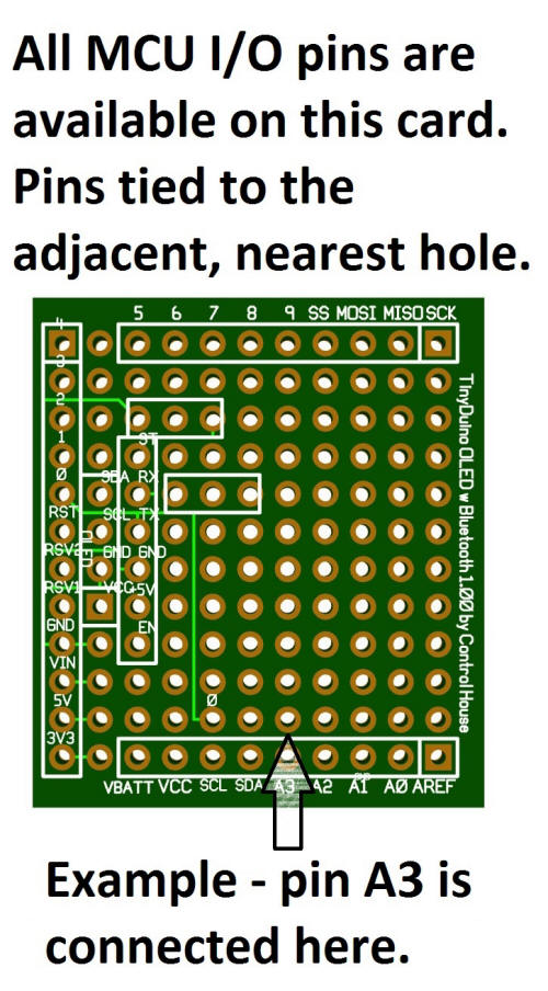 Features All I/O pins from the TinyDuino are available on this board. Holes adjacent to the header pins are tied to the microprocessor. 12 holese are reserved for the use of a .96" OLED display, HC-05 Bluetooth transceiver module, and it's required voltage divider circuit. The port for the bluetooth module is located on the bottom of the shield. That leaves 60 holes for your use as a prototype area. The stacking of boards allows enough room so that components may be mounted on the top or bottom of the circuit board. · Small size just slightly larger than the TinyDuino terminal shield. Actual size - 1.2"H x 1.365"W · Saves time develping circuits. In a short time you can develop a project that communicates and displays information or data. Truly plug and play · Through hole technology · Holes located on .100 centers · All holes are .040 in diameter making the connection of most devices possible · With the OLED installed, this board should be the top shield on the stack · Pins A4 & A5 are reserved for the I2C OLED display. Pins 0 & 1 are used for the serial connection to the bluetooth module |